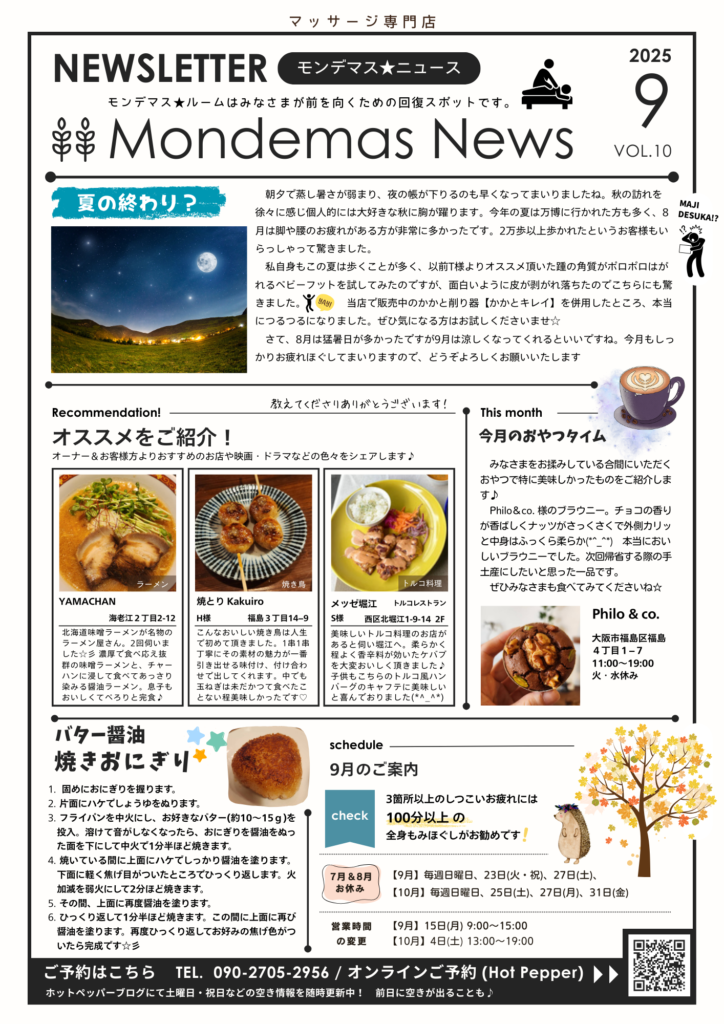 ※モンデマス★ニュースとは、みなさまより伺ったおいしいお店やドラマ・映画などをオーナー西野が視聴・訪店し感想を載せてみなさまにシェアする企画や、お店からのお知らせ、調理師でもあるオーナーおすすめの料理の簡単レシピなどを記載した情報紙です。毎月作成し店頭の看板・店内にて紙面をお配りしております。またブログやホームページでもご覧いただけます☆