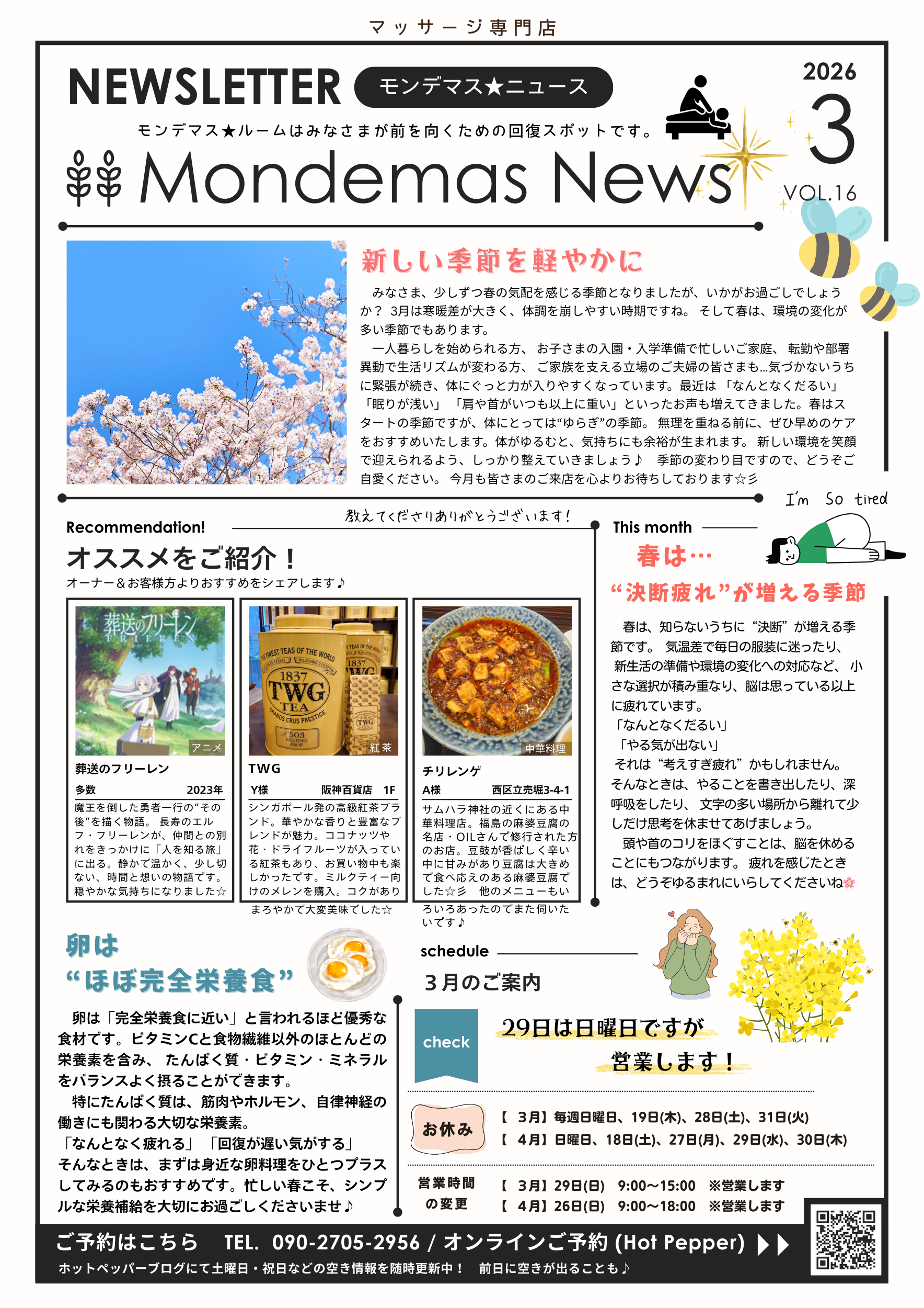 今月のテーマは「決断疲れ」。春は環境の変化が多く、肩こり・首こり・慢性疲労が強くなりやすい時期です。